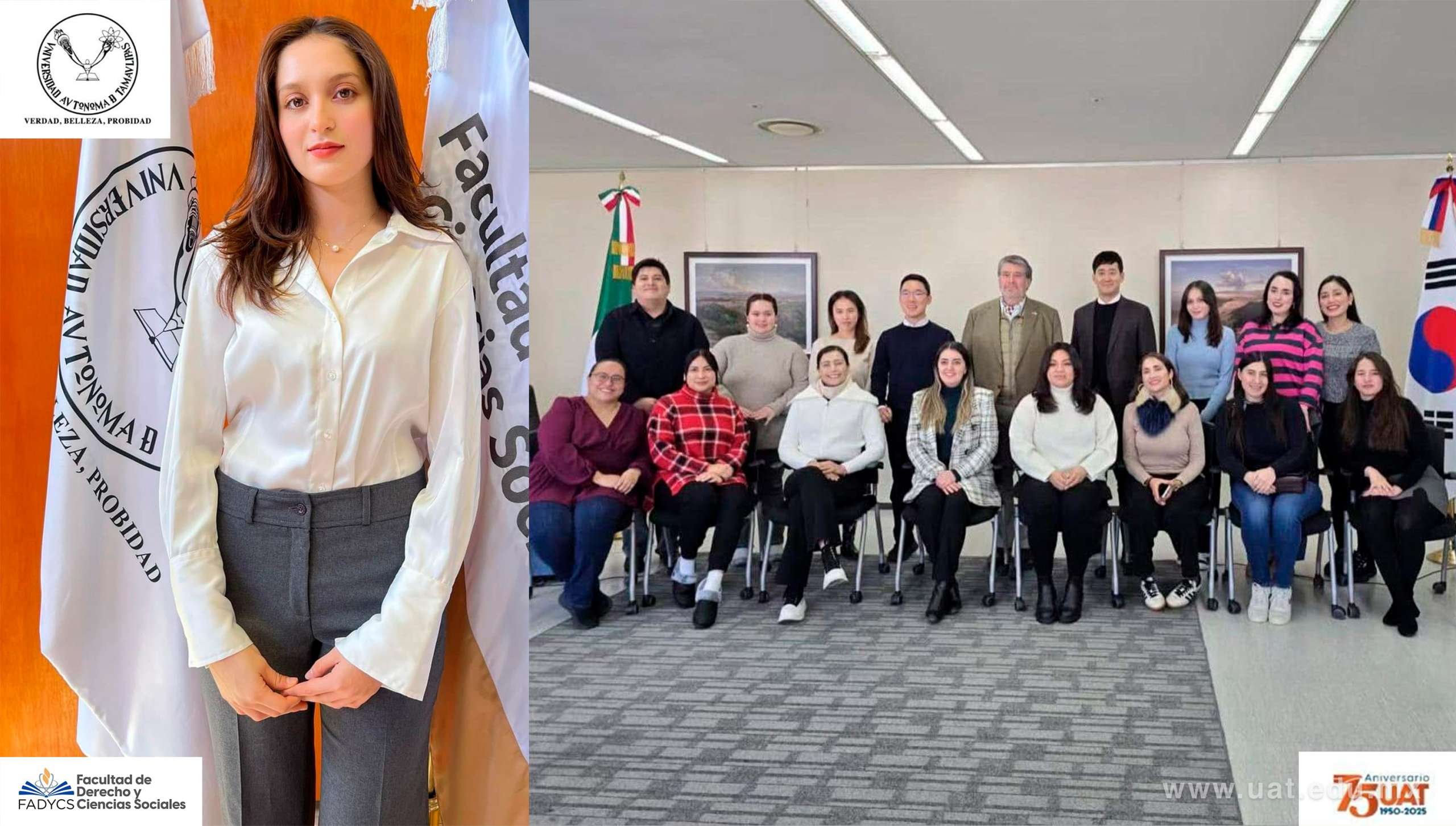 La estudiante de la Universidad Autónoma de Tamaulipas (UAT), Maripaz Barraza Mendoza, alumna del octavo semestre de la Licenciatura en Derecho de la Facultad de Derecho y Ciencias Sociales de Tampico (FADYCS), participó en una sesión informativa junto a especialistas internacionales en la Embajada de México en Seúl, Corea del Sur, donde formó parte de la Ventanilla Integral de Atención a la Mujer (VAIM).